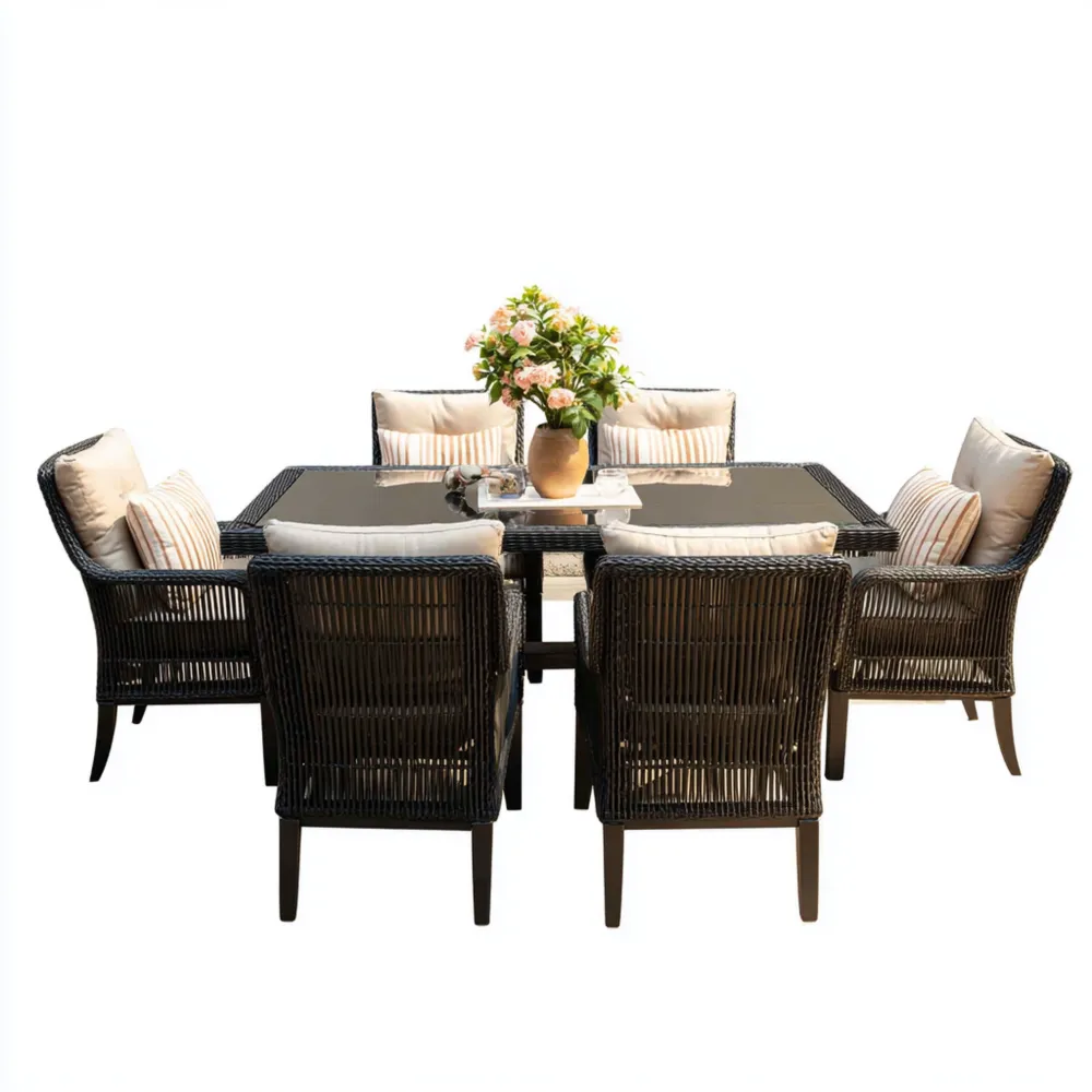 ProduktbeschreibungDieses stilvolle Garten-Esstisch-Set bietet Platz für bis zu sechs Personen und ist ideal für stilvolle Zusammenkünfte im Freien. Das Set vereint modernes Design mit hoher Funktionalität.
